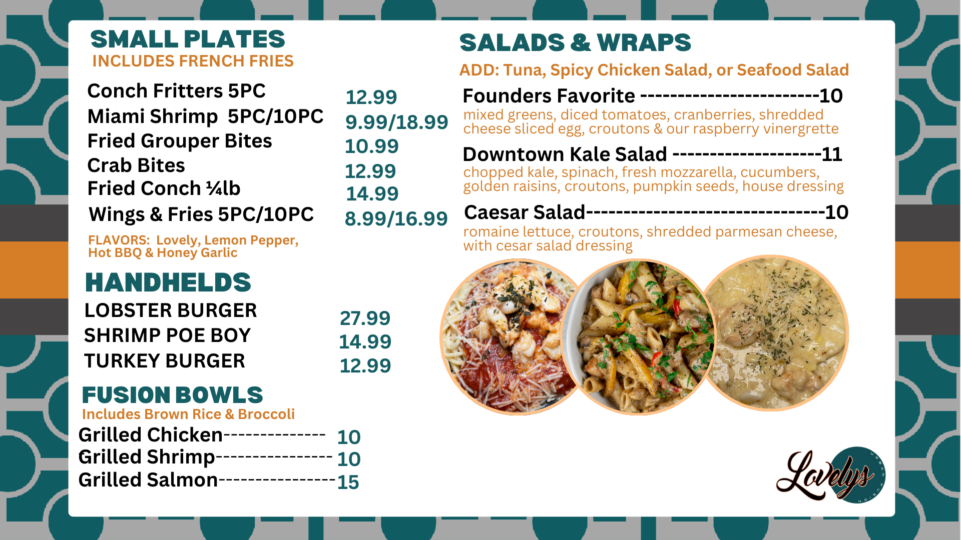 Located in the heart of Miami Gardens, we’re a mother-daughter owned restaurant serving up American comfort food with a Caribbean twist. From island-spiced pasta and crispy wings to lobster bites, shrimp platters, and refreshing signature lemonades, every dish is crafted with love, flavor, and community in mind. Whether you’re here to dine-in, grab take-out, or cater your next event, you’ll always get food that feels like home—seasoned with culture, passion, and family tradition. Come taste why Lovely’s Urban Fusion is more than just food—it’s an experience..